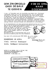 Na een flinke wandeling door het dorp Dodewaard, demonstreren ongeveer 50 mensen bij de kerncentrale tegen het ‘over de balk gooien’ van geld voor kernenergie. Er wordt ter plekke geld gedrukt en over de balk (de toegangsslagboom) gesmeten. Ook is er een Rad van Waanzin, deelnemers kunnen een inspectietocht in de kerncentrale winnen en iedereen krijgt een jodiumpil: in te nemen in geval van een ongeluk. Tevens is het de herdenking van 4 jaar Tsjernobyl.