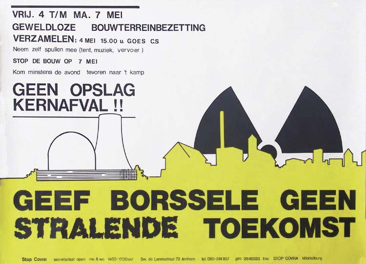Weer eens een meerdaagse actie. In Borssele (officieel het Industriegebied Vlissingen-Oost, maar gelegen in Nieuwdorp, gemeente Borsele) moet de COVRA (Centrale Organisatie voor Radioactief Afval) faciliteit gebouwd worden. Hier moet de komende ‘50-100 jaar’ al het Nederlandse radioactief afval opgeslagen worden, in afwachting van definitieve opslag (in zoutkoepels?). Het laag- en middelactief afval (in zee gedumpt tot 1982) ligt nu tijdelijk allemaal in Petten en het hoogradioactief afval (de brandstof) ligt bij en wordt vervoerd naar de opwerkingsfabrieken en zal pas na 1995 terug komen (zo is de planning op dat moment). Hoewel er in de directe omgeving veel protest is tegen de opslag, kunnen acties niet op al te veel sympathie rekenen in het dorp.